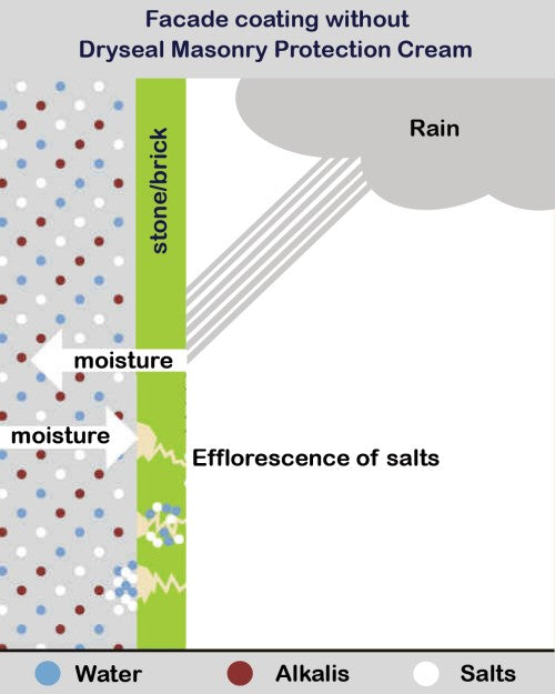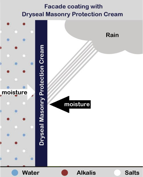 Dryseal is a unique, thixotropic, water repelling masonry protection cream which can be used on a range of building materials. Dependent on the porosity of the substrate, the effective siloxane ingredient penetrates the substrate within a short period of time (30 minutes to several hours), where it reacts to become a polymer